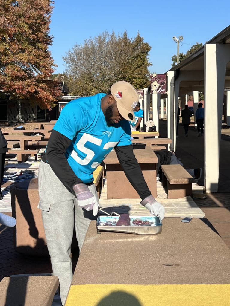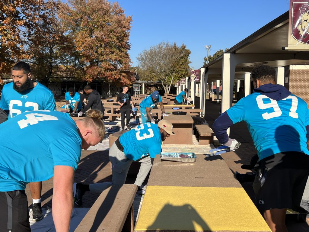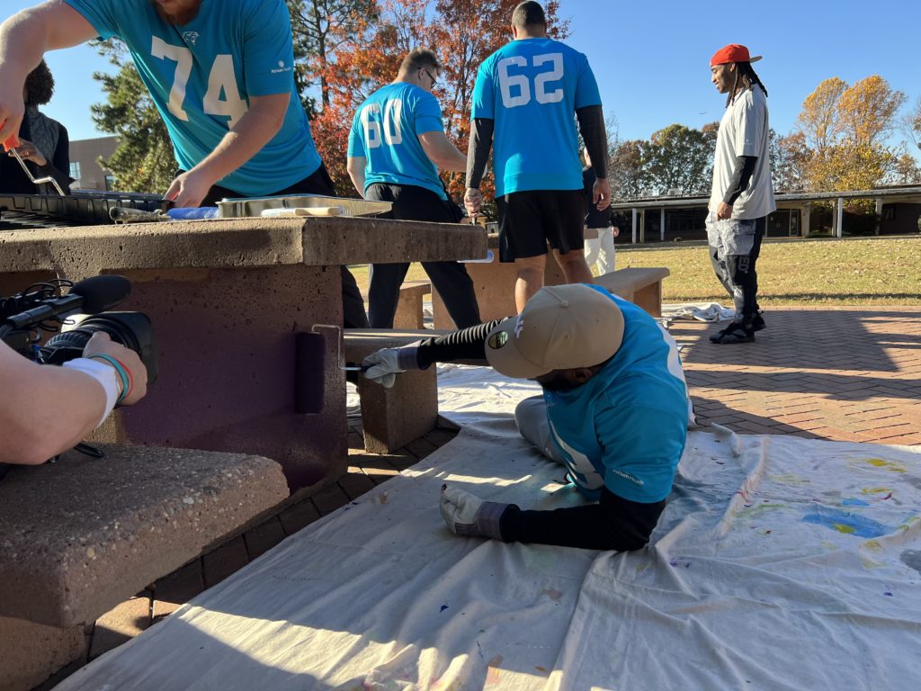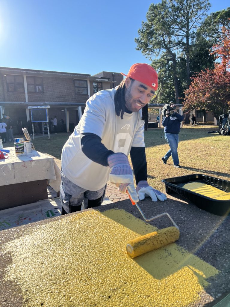 Carolina Panthers players showed their teamwork off the field as they took on beautification projects at Harding University High School. Players provided improvements to the school’s quad, which is the main gathering and meeting spot for the school’s 1,800 students, and rose courtyard.