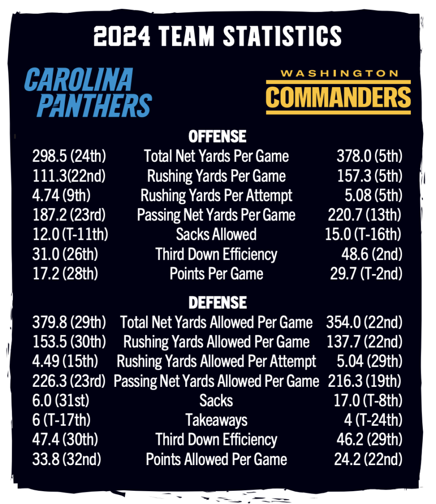 - In his first career game, Quarterback Jayden Daniels rushed for 171 yards and three rushing touchdowns. Daniels is tied for eighth in the league among all offensive players with four rushing touchdowns and currently ranks nsecond among all quarterbacks. Running back Brian Robinson Jr. ranks tied for third among all offensive players for rushing touchdowns.