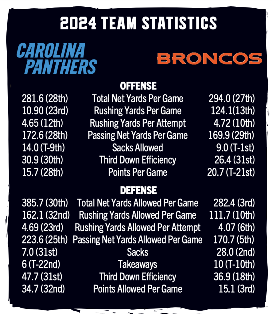 All-time, this will mark the eighth regular-season matchup between the two clubs with Denver leading 5-2. The Panthers will look for their first ever win in Denver, having lost the previous three games played there. The two teams squared off in Super Bowl 50, with Denver taking the crown, 24-10. The Panthers were victorious in the last matchup, with Carolina winning 23-10 in Week 12 of the 2022 season in Bank of America Stadium.