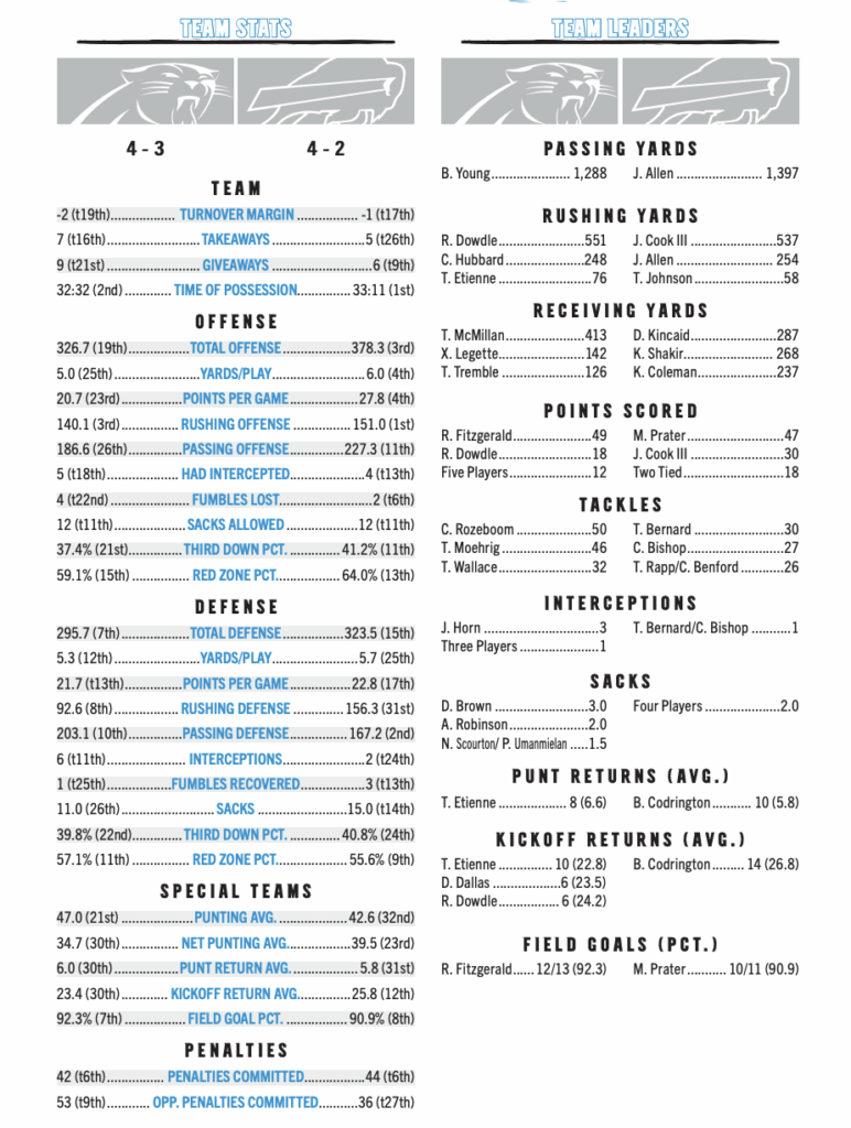 Buffalo travels to Carolina following their Week 7 Bye. As a starter, Buffalo QB Josh Allen is 7-0 following a Bye Week, with his team outscoring opponents by an average of nearly 11 points per game. In Buffaloās last visit to Carolina, they were held to three points in a Panthers 9-3 win (09/17/17), tied for the second-fewest points ever allowed by the Panthers to an AFC opponent.