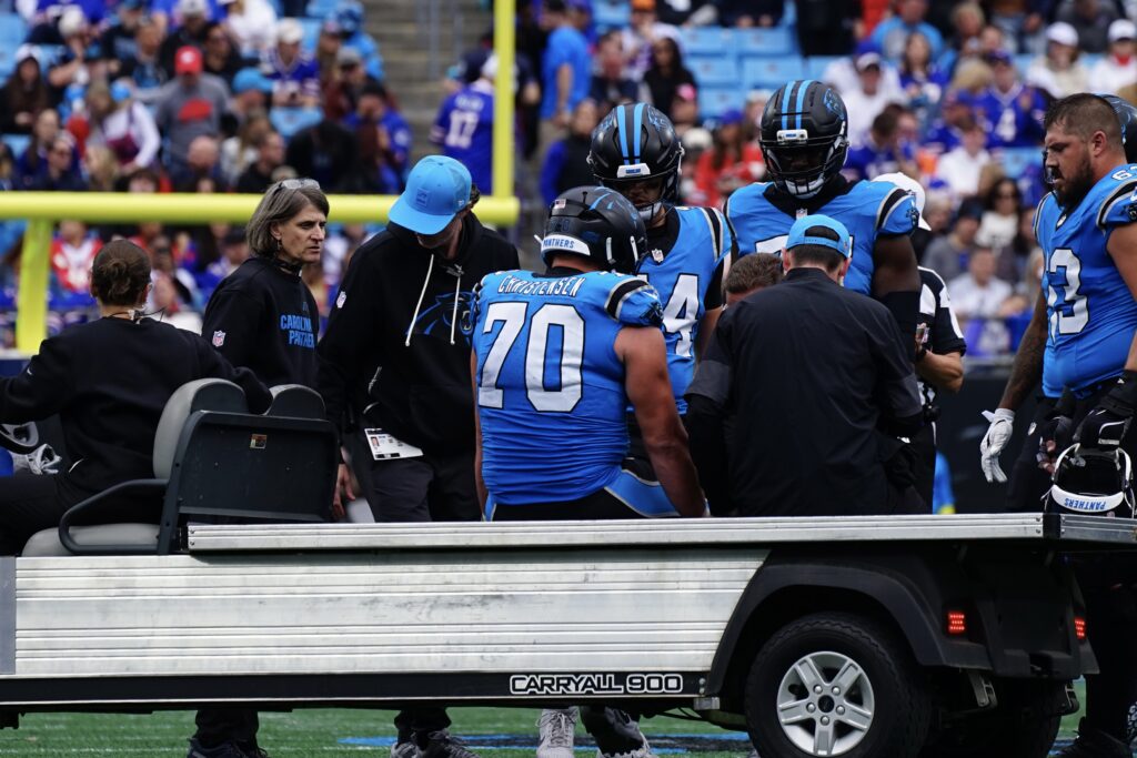 Brady Christensen left the Panthers’ 40-9 loss to the Bills on a cart early in the fourth quarter. After the game head coach Dave Canales announced the do-it-all offensive lineman will be sidelined indefinitely with what is believed to be a ruptured Achilles.