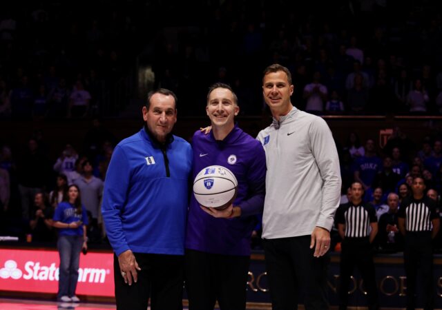 Coach K, Jon Scheyer and Greg Paulus meet center court at Cameron Indoor ahead of the Brotherhood Run between Duke and Niagara.